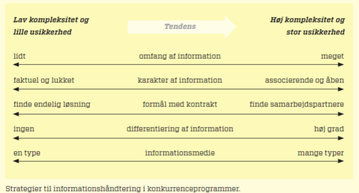 Information kan afgives – og tolkes – som henholdsvis en instruktion, der skal følges nøje, og et forslag, der kan inspirere til videre bearbejdning (Kreiner 2010). De to måder at tænke information på – som instruks eller inspiration – hænger for os at se nøje sammen med, hvilken informationsstrategi, og dermed kontraktform, bygherren tilstræber. I den komplette kontrakt er målet, at information er udtømmende og derfor lukket for fortolkning. Derimod vil den relationelle kontrakt ikke forsøge at diktere handlinger og vil derfor være mere optaget af at skabe motivation til, og forudsætninger for, konkurrenceholdenes egen medvirken (Milgrom and Roberts 1992). Billedligt talt er information her ikke et faktum, der overføres, men et frø, der plantes.