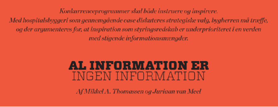 Teoretisk tager vores artikel sit afsæt i informational economics’ pointering af, at der er grænser for, hvor meget vi som individer kan overskue. Og at der derfor er omkostninger ved at formidle, tilegne og behandle information. Som gennemgående casePå i2p.dk er præsenteret en række cases, projektforløb, der kan fungere som inspiration og ”udfoldning” af hvordan andre har arbejdet med programmering, interessentinvolvering og projektudvikling i byggeriets indledende faser. fokuserer artiklen på den kravsstillelse, bygherren udøver over for arkitekter og rådgivende ingeniører ved udformning af et konkurrenceprogram. Vi ser denne case som en specifik udgave af en mere generel problemstilling, der vil gælde hele vejen gennem projekterings- og byggeforløbet: Hvordan bygherre og byggeriets parter samarbejder og indgår aftaler i en verden med ufuldkommen information. Artiklen er en bearbejdning af et udviklingsforløb i regi af Idé til program (www.I2p.dk), hvor artiklens forfattere i samarbejde med bygherrefunktionen for to kommende hospitalsbyggerier har forsøgt at indkredse, hvordan konkurrenceprogrammer kan forene hensynet til både kontrol og kreativitet.