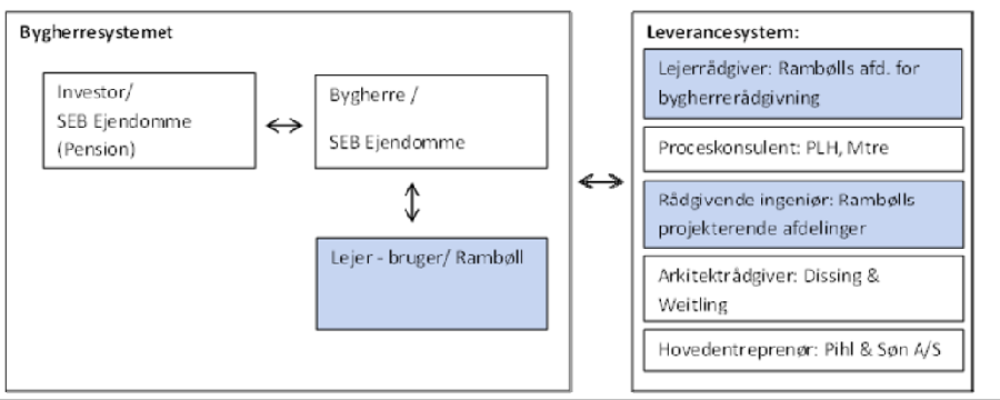 SEB Pension har været investor i projektet, mens SEB Ejendomme har været den overordnede bygherre, der har haft ansvaret for byggeriet udadtil og for de overordnede beslutninger. Rambøll Danmark har været lejer og brugerEn bruger defineres ved at være grupper af personer, som er direkte påvirket af byggeprojektet. . For at koordinere bygherrens og lejerens (Rambøll) krav og ønsker til byggeriet blev der afholdt ugentlige projektledelsesmøder, hvor Rambølls lejerrådgiver deltog. Lejerrådgiveren har haft til opgave at sørge for at Rambølls visioner og prioriteringer blev opretholdt gennem projektet. Lejerrådgivningen blev varetaget af Rambølls afdeling for bygherrerådgivning, dog bistået af proceskonsulenter i både programfasenI Programfasen skal opgave og materiale kvalificeres på en sådan måde, at det danner et solidt underlag for organisering, strukturering og udførelse af byggeprojektet. og i projekteringsfasen. Samtidig med at lejekontrakten mellem SEB Ejendomme og Rambøll blev underskrevet (maj 2006), havde Rambøll en drøftelse med SEB Ejendomme om, hvordan byggeriet skulle gennemføres. Det blev besluttet på Rambølls opfordring at gennemføre det som partnering, hvor både arkitekt og entreprenør blev involveret i projektet fra starten. Rambøll skulle selv stå for ingeniørarbejdet. Når Rambøll foretrak partnering som samarbejds- og kontraktform var det en del af en branding af koncernen.