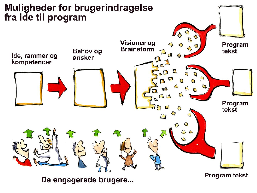 Når I udvælger brugergrupperne, skal I sørge for at tildele dem et ansvar hver især for at få funktionsbeskrevet det område, de er særligt eksperter på. I processen kan brugerne fx udfylde skemaer, lave undersøgelser over forskellige behov, eller de kan tegne daglige ruter eller gøremål ind på en tegning. I kan også udstyre brugerne med et kamera, hvor de kan tage billeder fra nogle hverdagssituationer. Mulighederne er uanede - find selv på flere - eller søg efter forskellige metoder. Brugergrupperne nedfælder i samråd med en facilitator et skriftligt katalog. Dette katalog kan så vedlægges byggeprogrammet.